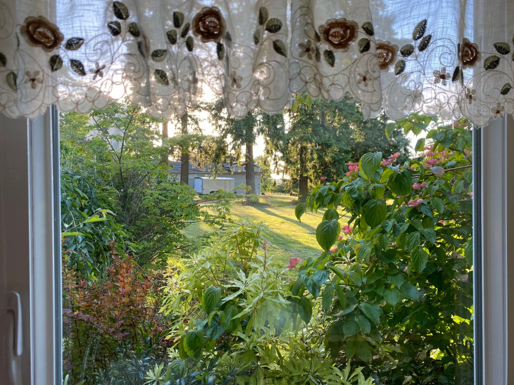 And as we wait, the four of us are settling into the sounds and play of light on the farm—the rooster crow, the porch swing creak, the movement of shadows on the pastures. The stately trees and birdsong, the view through the kitchen window, the owner’s warm hospitality, all are beckoning to us—breathe in the present moment, slowly, slowly.